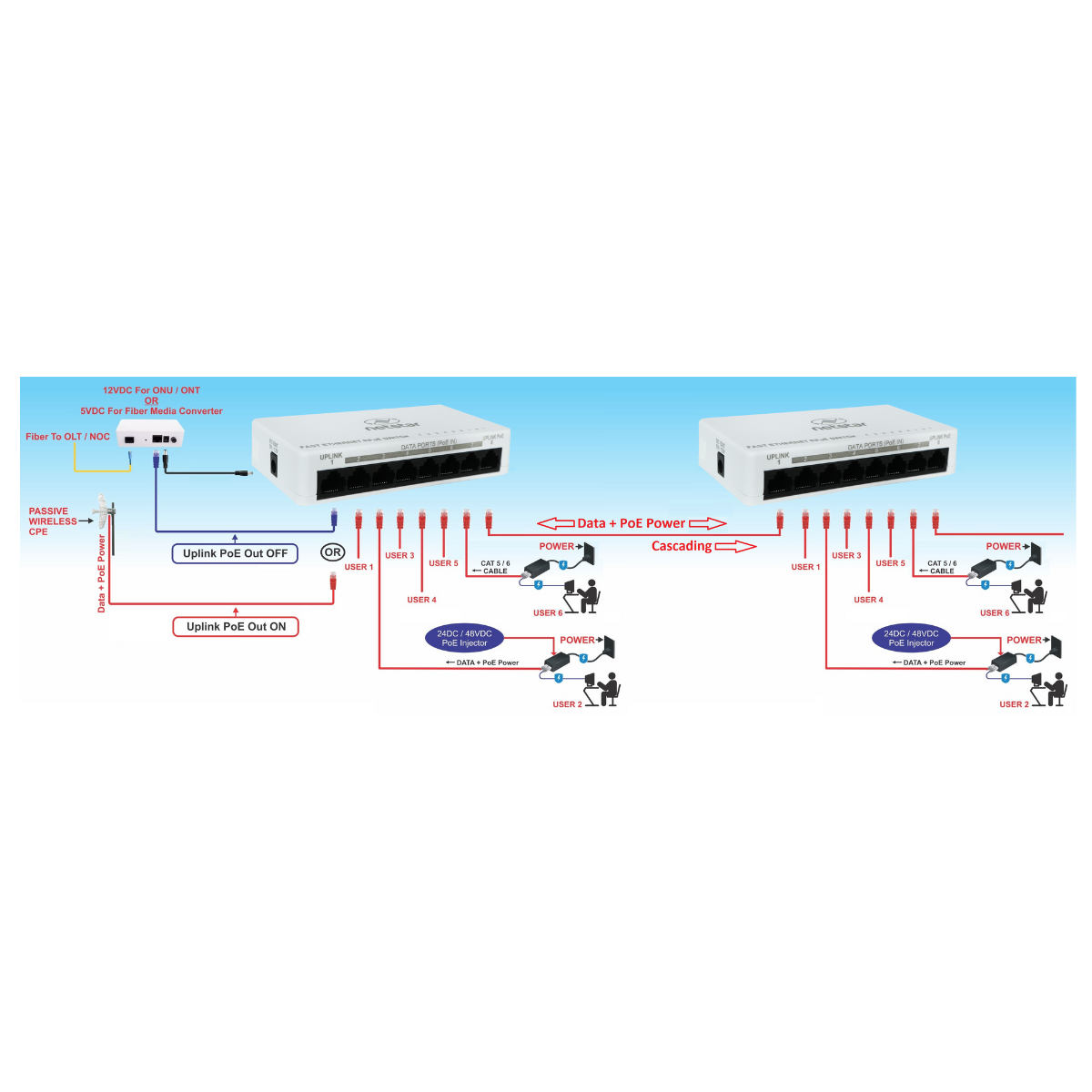 | Uplink | 1 x 10/100Mbps Uplink Port (Port 1) Data Uplink OR Data+PoE Out Uplink by Toggle Slider 1 x 10/100Mbps Data+PoE Out Uplink Port (Port 8) |